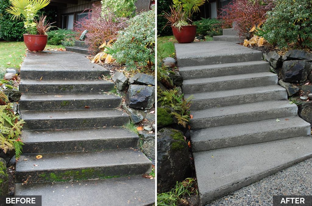 - Once everything is cleared and free of debris, we apply an organic outdoor detergent in the needed areas.